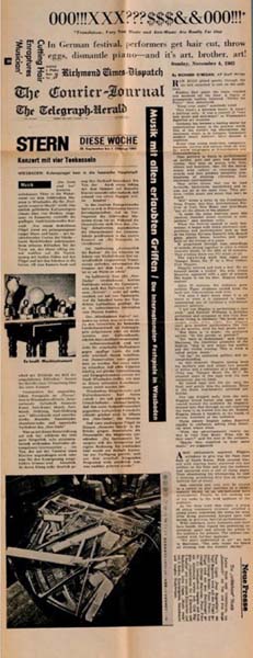 (Maciunas, George / Tomas Schmit): Ekstra Bladet. [Copenhagen]. [Fluxus in Europe]. 1963. 59 x 21 cm. 1 Blatt. Wenige kleine Randeinrisse, gutes Exemplar. Gedruckte Collage aus Zeitungsartikeln von 1962 und 1963 mit Bezügen zu den ersten und frühesten Fluxus-Events und Ereignissen. Das Blatt, beidseitig bedruckt, enthält Ausschnitte aus Berlingske Tidende, The Telegraph Herald, Stern, Neue Press, The Courier – Journal, Richmond Times-Dispatch. Die Gestaltung erfolgte durch George Maciunas in Zusammenarbeit mit Tomas Schmit. Die Edition erschien als „Fluxus Newspaper Roll“ (hier ungerollt). Es wurden zwei Varianten herausgegeben, „Ekstra Bladet“ und „Politiken“. Eine Neuauflage beider Blätter findet sich in der Box „George Maciunas und Fluxus-Editionen“. Exemplar auf holzhaltigem Zeitungspapier. [Vgl. John Hendricks, Fluxus-Codex. 1988, S. 43; Silverman 543; Fondazione Bonotto, Fluxus Collection, Code FX 1091].