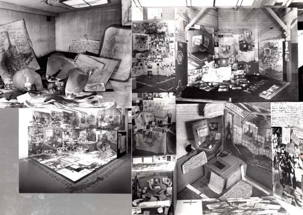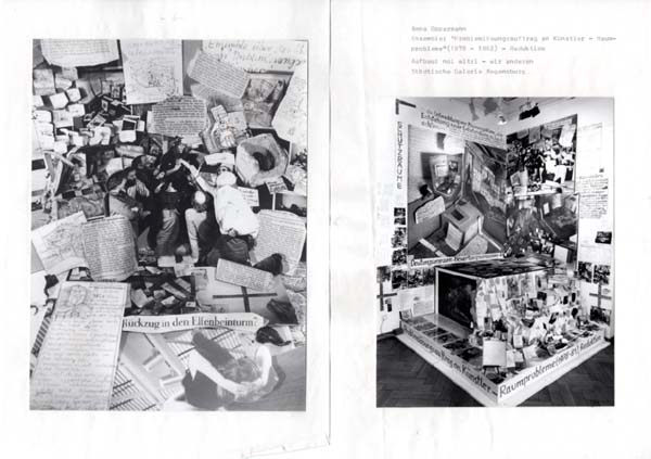 Oppermann, Anna: Der Elfenbeinturm. Materialien zu einer Ausstellung. Kassel. Orangerie. 1981. 29,8 x 21 cm (Schreiben mit Fotos); 30,3 x 24 cm (Fotos); 21,4 x 15 cm (Fotos). 7 unpaginierte Blätter. Zwei Blätter mit Einrissen und kleinen Fehlstellen. Große Fotos genadelt. Sonst gutes Exemplar. Ensemble Fotografien „Problemlösungsauftrag an Künstler – Raumprobleme“: 2 Blatt DIN A4 mit Schreibmaschinentext und 2 montierten Schwarz-Weiss-Fotos, 3 Fotos Installationsprozess sowie zwei Großfotos Schwarz-Weiss, 30,5 x 24,0 cm mit Installationsansicht, entworfen für die Ausstellung „Der Elefenbeinturm“. (Alle abgebildet in Kunstforum 51).
