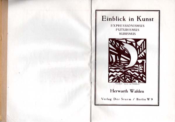 Walden, Herwarth: Einblick in Kunst. Expressionismus. Futurismus. Kubismus. Erste Auflage. Berlin. Verlag Der Sturm. 1917. 26,4 x 18,6 cm. 173 S. OPappband mit Rückenschildchen. Einband etwas angestaubt, leicht berieben und lichtspurig. Rücken nachgedunkelt. Vorsatzpapiere nachgedunkelt. Seiten innen minimalst knittrig. Sonst noch gutes Exemplar. Durchgehend mit schwarz-weißen Abbildungen versehen. Text in deutscher Sprache. Auf Vorsatz und Titelblatt eine Abbildung eines Holzschnittes von Jacoba van Heemskerck. Erste Auflage [W./G. 1334, 7].