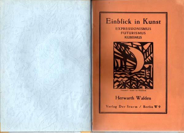 Walden, Herwarth: Einblick in Kunst. Expressionismus. Futurismus. Kubismus. Erste Auflage. Berlin. Verlag Der Sturm. 1917. 26,4 x 18,6 cm. 173 S. Illustrierter OKarton in privatem Halbleinen aufgebunden. Datumseintrag auf Vortitel. Einband etwas angestaubt. Rücken nachgedunkelt. Hinterer Buchdeckel der originalen Kartonierung fehlt. Sonst noch gutes Exemplar. Durchgehend mit schwarz-weißen Abbildungen versehen. Text in deutscher Sprache. Auf Vorsatz und Titelblatt eine Abbildung eines Holzschnittes von Jacoba van Heemskerck. Erste Auflage [W./G. 1334, 7].