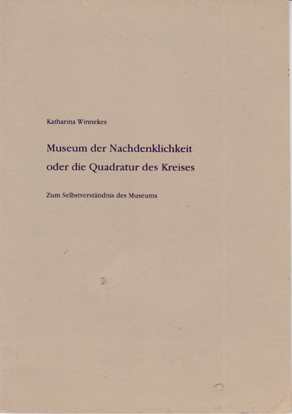 Winnekes, Katharina: Museum der Nachdenklichkeit oder die Quadratur des Kreises. Zum Selbstverständnis des Museums. Auflage 1000 Exemplare. Köln. Diözesanmuseum. 1995. 21 x 14,5 cm. 13 S., 1 Blatt. OBroschur. Einbandkanten etwas lichtrandig und mit kleinen Bereibungen, Vorderdeckel mit kleinen Fleckchen. Sonst gutes Exemplar. Textreihe Diözesanmuseum Köln Heft 4.