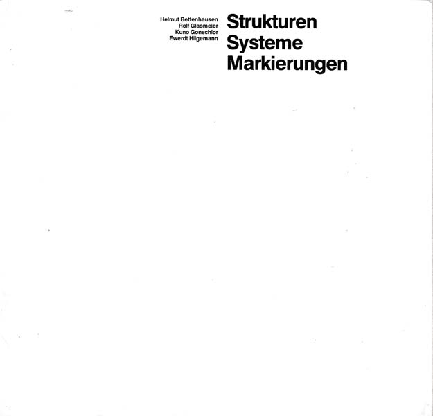Bettenhausen, Helmut: Strukturen, Systeme, Markierungen. Erste Auflage. Herne. Pieperdruck + Verlag KG. 21 x 20 cm. 16 unpaginierte S. OBroschur. Etwas berieben und fleckig, sonst gutes Exemplar. Mit Werken von Helmut Bettenhausen, Rolf Glasmeier, Kuno Gonschior und Ewerdt Hilgemann. Durchgehend mit schwarz-weiß Abbildungen versehen. Mit einer handschriftlichen Signatur durch Helmut Bettenhausen auf seiner Titelseite.
