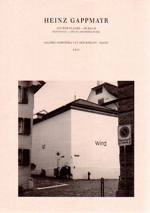 Gappmayr, Heinz: Auf der Fläche – Im Raum. Paintings + Art-in-Architecture. 1. Auflage. Mainz / München. Chorus Verlag für Kunst und Wissenschaft. 2000. 30 x 21 cm. OKarton mit OUmschlag. Umschlag minimal berieben, sonst sehr gutes Exemplar. Dokumente unserer Zeit ; XXVI. Texte in Deutsch und Englisch. Mit einem Beitrag von Martin van der Koelen. Durchgehend mit schwarz-weiß Abbildungen versehen. Erschien anläßlich der Ausstellung Heinz Gappmayr „Paintings + Art-in-Architecture“ vom 7. Oktober bis 15. Dezember 2000 in der Galerie Dorothea van der Koelen, Mainz.Mit beiliegender Preisliste.
