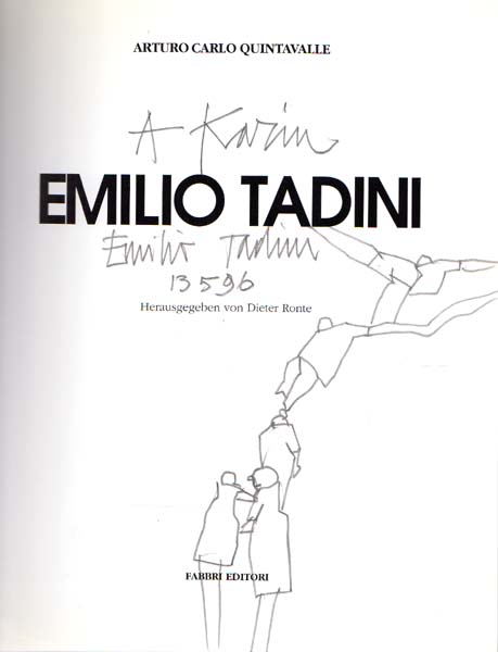 Tadini, Emilio – Dieter Ronte[Herausgeber]: Emilio Tadini. Erste Auflage. Milano. RCS Libri & Grandi Opere S.p.A. 1995. 31 x 26 cm. 155 S. Illustrierter OKarton. Einband leicht nachgedunkelt und minimal an den Kanten berieben, sonst gutes Exemplar. Erschienen anlässlich der Ausstellung des Institut Mathildenhöhe Darmstadt vom 12. Mai – 16. Juni 1996. Durchgehend mit meist farbigen Abbildungen versehen. Mit einer auf dem Titel versehenen handschriftlichen Signatur und Widmung des Künstlers, an die deutsche Kunsthistorikerin Karin von Maur, datiert auf den 13. Mai 1996. Nebenst dieser eine ebenfalls mit Bleistift gezeichnete Skizze.
