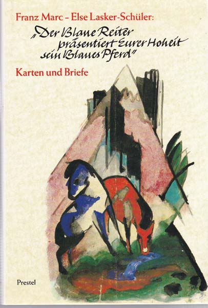 Marc, Franz [und] Else Lasker-Schüler: Der Blaue Reiter präsentiert Eurer Hoheit sein Blaues Pferd. Karten und Briefe. Herausgegeben und kommentiert von Peter-Klaus Schuster. 4. Auflage. Mchn. Prestel Verlag. 1989. 25 x 17 cm. 167 S. OPappband mit llustriertem OUmschlag. Umschlagkanten nachgedunkelt, Rücken aufgehellt, etwas angestaubt. Gutes Exemplar Mit zahlreichen Farbabbildungen der von Marc gestalteten Postkarten und Malerbriefe.