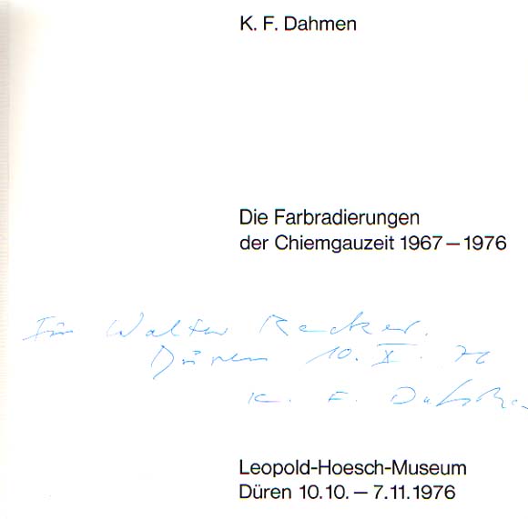 Dahmen, K. F.: Die Farbradierungen der Chiemgauzeit 1967 – 1976. Leopold Hoesch Museum, Düren, 10.10. – 7.11.1976. 1. Auflage. Düren. Leopold Hoesch Museum. 1976. 21 x 21 cm. 31 S. OKarton. Umschlag etwas lichtrandig, gutes Exemplar. Mit dreizeiliger handschiftlicher Widmung von Dahmen, signiert, datiert 10. X. 76.
