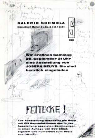 Beuys, Joseph: Fettecke. Galerie Schmela, 29. September [1972]. Düsseldorf. Galerie Schmela. 1972. 15,0 x 10,5 cm. Kartonierte Karten. Etwas nachgedunkelt, sonst sehr gutes Exemplar. Galerie Schmela, Ausstellung 125. Einladungskarte zu der von Schmela im Juni 1972 (Ausstellung 130, Zeichnungen I / 1949-1969) veranstalteten Ausstellung, zu der anstelle eines Kataloges ein Werkverzeichnis der Zeichnungen in 500 signierten Exemplaren erschien, auf das hier auch hingewiesen wird. Die Karte beidseitig mit Wiedergaben von Zeichnungen Beuys´versehen. [Vgl. Alfred Schmela. Galerist – Wegbereiter der Moderne, S. 75 / 75, Nr. 125].