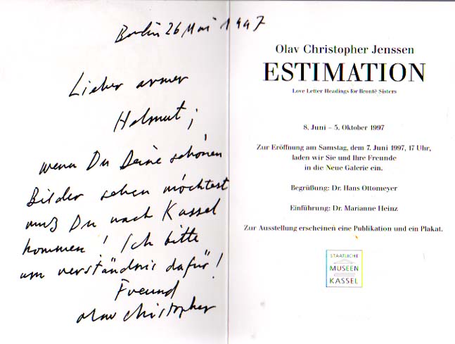 Jenssen, Olav Christopher: Eigenhändige Briefkarte. 1 Blatt. Sehr gutes Exemplar. Einladungskarte des Museum Neue Galerie Kassel, 8. Juni – 5. Oktober 1997 zur Ausstellung „Estimation“. Klappkarte, auf der linken inneren blanken Seite ganzseitig als Briefkarte benutzt mit zehnzeiligem handschriftlichem Text, signiert Olav Christopher.