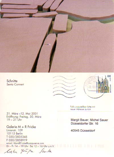 Connert, Senta: Schnitte. Galerie M + R Fricke, Berlin, 31. März – 12. Mai 2001. [Einladungskarte / Invitation Card]. Berlin. Galerie M + R Fricke. 2001. 10,5 x 15 cm. OKarton. Gutes Exemplar. Postalisch gelaufene Einladungskarte. Verso mit handschriftlichem Gruß der Künstlerin, signiert mit „Senta“. Mit einer farbigen Abbildung.