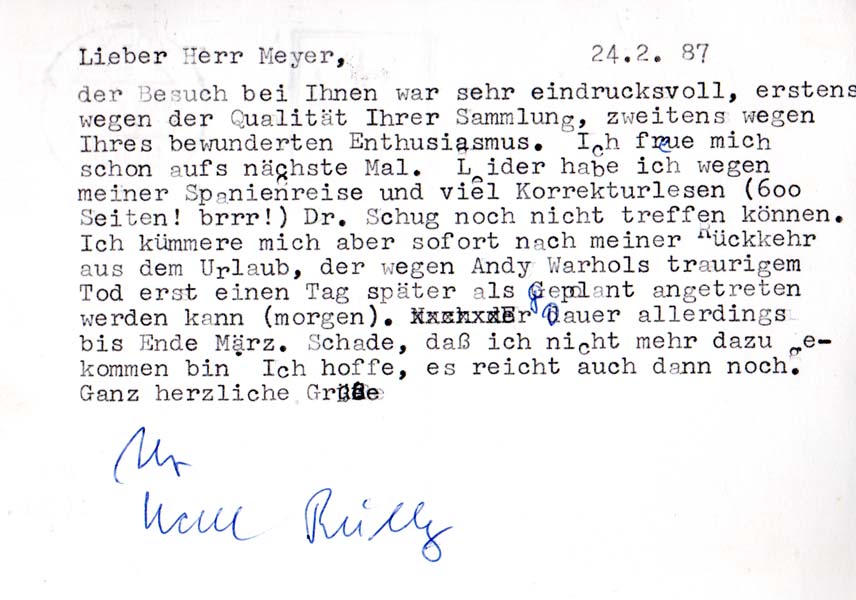 Ruhrberg, Karl: Maschinenschriftliche Postkarte. 15,0 x 10,5 cm. 1 Blatt. Sehr gutes Exemplar. Schreiben an einen Sammler anläßlich eines zurückliegenden Besuches. 15 Zeilen, handschriftlich unterzeichnet, datiert 24.2.1987.
