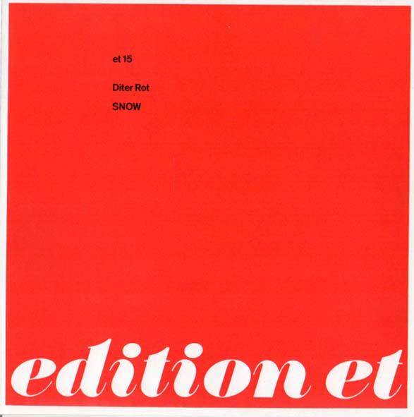 Rot, Diter: Snow. edition et 15. Berlin. Edition et im Verlag Christian Grützmacher. 1966. 23 x 23 cm. 16 lose einliegende Faltbögen, 1 Blatt. OKarton-Mappe. Mappe am oberen und unteren Kapital etwas eingerissen, sonst noch sehr gutes Exemplar. Erste Ausgabe. Das lose einliegende Textblatt mit einem Vorwort von Daniel Spoerri sowie 16 großformatig faltbare Bildwiedergaben einer 1964 entstandenen Fotoarbeit. [Vgl. Dobke, WVZ Bücher, S. 164].