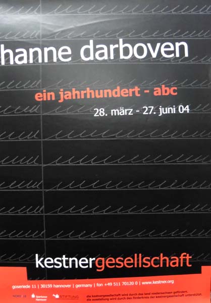 Darboven, Hanne: ein jahrhundert – abc. [Plakat] Kestner-Gesellschaft, Hannover. 28. März – 27. Juni 2004. Hannover. Kestner-Gesellschaft. 2004. 84 x 59 cm. Ein kleiner Riss am oberen Steg, geringe Druckstellen im Papier. Gutes Exemplar.