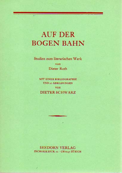 Roth, Dieter – Dieter Schwarz: Auf der Bogen Bahn. Studien zum literarischen Werk von Dieter Roth. Mit einer Bibliographie und 27 Abbildungen von Dieter Schwarz. [Die vorliegende Arbeit wurde von der Philosophischen Fakultät I der Universität Zürich als Dissertation angenommen; sie erscheint hier in erweiterter Form]. Auflage: 500 Exemplare. Zürich. Seedorn Verlag. 1981. 21 x 15 cm. 229 S. OKarton mit OUmschlag. Rücken etwas aufgehellt, sonst gutes Exemplar. Mit Abbildungen auf Tafeln.