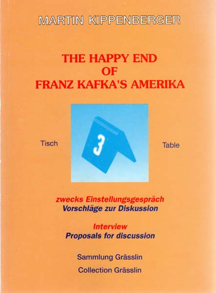 Kippenberger, Martin: The Happy End of Franz Kafka`s Amerika. Tisch. Zwecks Einstellungsgespräch. Vorschläge zur Diskussion / Table. Interview. Proposals for discussion. Sammlung Frässlin / Collection Grässlin. Erste Auflage, 1200 Exemplare. [St. Georgen]. Collection Grässlin. 1993. 23 x 17 cm. 514 unpaginierte S. OKarton. Minimale Radierspur am Vorsatz. Kanten am Rücken marginal berieben. Sehr gutes Exemplar. Als Bestandteil der Ausstellung „The Happy End of Franz Kafka`s Amerika“ in Rotterdam, Museum Boymans-van Beuningen herausgegebenes Künstlerbuch mit 237 unkommentiert wiedergegebenen Schwarz-Weiß Reproduktionen von deutschen Taschenbuchcovern der 50er, 60er und 70er Jahre mit einem 15seitigen Register mit englischen Übersetzungen der Buchtitel sowie einer anhängenden Liste aus dem Adressbuch von Karola Grässlin mit aktualisierten Postleitzahlen. Trotz der hohen Auflage heute eher selten. [Vgl. Uwe Koch. Kommentiertes Werkverzeichnis der Bücher von Martin Kippenberger, Nr. 126].