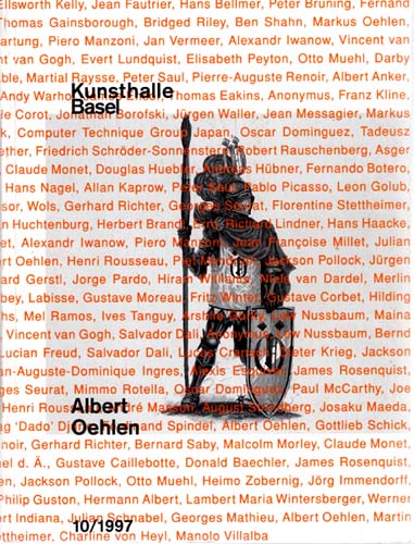 Oehlen, Albert: Albert Oehlen. albert vs. history. Kunsthalle Basel, 10 / 1997. Für Martin Kippenberger. Erste Auflage. Basel. Kunsthalle. 1997. 22,6 x 17,1 cm. 224 unpaginierte S. OKarton. Gutes bis sehr gutes Exemplar. Oehlen schuf für und mit diesem Katalog eine Collage von Bildzitaten aus alter –, klassischer – und zeitgenösischer Kunst, die für seine Arbeit von Bedeutung sind. Der unkommentierte Bildessay „liest“ sich wie ein Statement seiner künstlerischen Recherchen. Beiliegend ein Zeitungsausschnitt zur Ausstellung. Ferner dabei zwei Einladungskarten zu Ausstellungen Oehelns in den Galerien Aslan Crone und Gisela Capitain von 1991 und 1997.