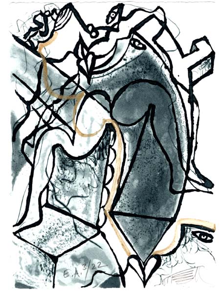 Vostell, Wolf: Abstrakte Figuration mit Teilbetonierung. Auflage 444 arabisch nummerierte Exemplare. Berlin. Eigenverlag des Künstlers für die Berliner beratungsgesellschaft für Stadterneuerung und Modernisierung. 1997. 21,5 x 15,5 cm. 1 Blatt. Sehr gutes, frisches Exemplar. Heliogravüre und Radierung in Schwarzgrau auf Bütten mit Goldlinie überzeichnet. Unten links als EA bezeichnet, nummeriert 3/22, unten rechts signiert. Es existieren verschiedene Varainten in der Nummerierung, Farbkombination, Signatur wie auch ohne Goldlinie. Hier eines der Variante III, als EA bezeichnet aber dennoch nummeriert. Diese Exemplare waren wohl Geschenkexemplare Vostells. [Vgl. Wolf Vostell. Die Druckgrafik. 2005, S. 248, 1997.1-III].