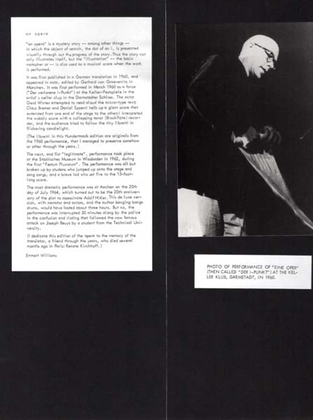 Williams, Emmett: an opera. Auflage 50 Exemplare. Köln. Edition Hundertmark. 1987. 40,0 x 16.5 x 1.5 cm. 3 Blatt. OPapp-Box. Gutes bis sehr gutes Exemplar. 112. Editions Box, Edition Hundertmark. Enthält in einer weißen Papp-Box 3 schwarze Kartons mit je einem montiertem erläuternden Text, einer lose montierten Offset-Tafel mit einem mikroskopisch klein gesetztem Text aus einem Libretto von Emmett Williams von 1960 sowie ein lose montiertes Schwarz-Weiss Foto von Williams während einer Performance von „Eine Oper“ 1960 in Darmstadt. Auf der Offsettafel handschriftlich von Emmett Williams signiert, aber nicht wie üblich nummeriert. Dabei eine Lupe zum Lesen des Libretto-Textes.