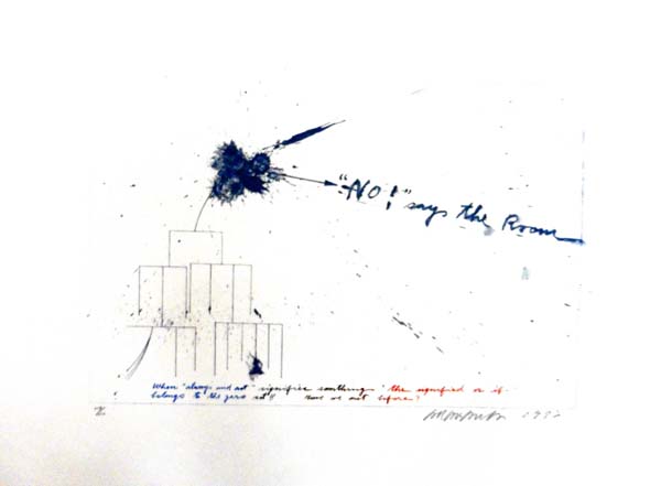 Arakawa, Shusaku: No! says the Rom. 1 Blatt. Blattinneres gleichmäßig etwas nachgedunkelt (entrahmt), sonst gutes Exemplar. Farbiger Siebdruck, 28 x 42 cm (Blatt 58,5 x 71,0 cm), auf leichtem Karton. Numer 104 / 110 nummerierten, unten rechts signierten und 1972 datierten Exemplaren.