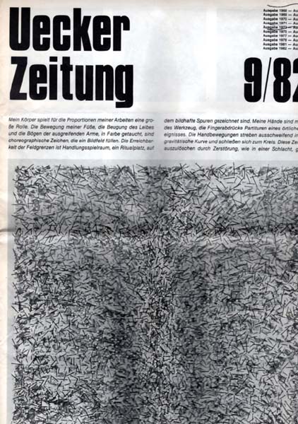 Uecker, Günther: Uecker Zeitung 9/82. Düsseldorf. Selbstverlag Günther Uecker. 1982. 48 x 32 cm. 16 S. OBroschur. Mittig gefaltet, etwas angerändert, sonst gutes Exemplar. Nummer 9 der seit 1968 erscheinenden Uecker Zeitung, die sich ausschließlich mit Uecker-Projekten, – Objekten und – Werken beschäftigt. Mit einigen Abbildungen. [Versand in Rollenform, Porto erhöht sich auf 4,00 Euro].
