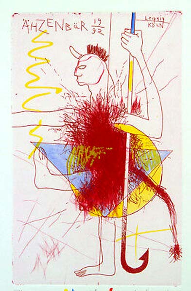 Novaky, Akos: Ähzenbär. Leipzig / Köln 1992. Im unteren Rand eine sehr kleine Feuchtigkeitsspur, sonst sehr gutes Exemplar. Farbradierung auf Fabriano Bütten, 49,5 x 34,5 cm. Im unteren Plattenrand signiert, datiert 92 und betitelt, nummeriert VIII / XX. Frei gerahmt in goldener Metallleiste unter Glas.