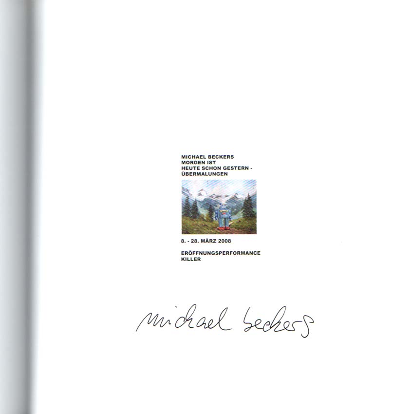 Beckers, Michael: Morgen ist heute schon gestern – Übermalungen. Galerie Slowboy, Düsseldorf, 8.-28. März 2008. 1. Auflage. Düsseldorf. Galerie Slowboy. 2008. 21 x 21 cm. 30 unpaginierte S., Audio-CD (Spielzeit: 6:02 Minuten). OKarton. Sehr gutes Exemplar. Titelblatt handschriftlich von Michael Beckers signiert. Durchgehend mit meist ganzseitigen Farbabbildungen versehen. Beiliegend: Einladungskarte zur Eröffnung der Ausstellung, handschriftlich von Michael Beckers signiert.
