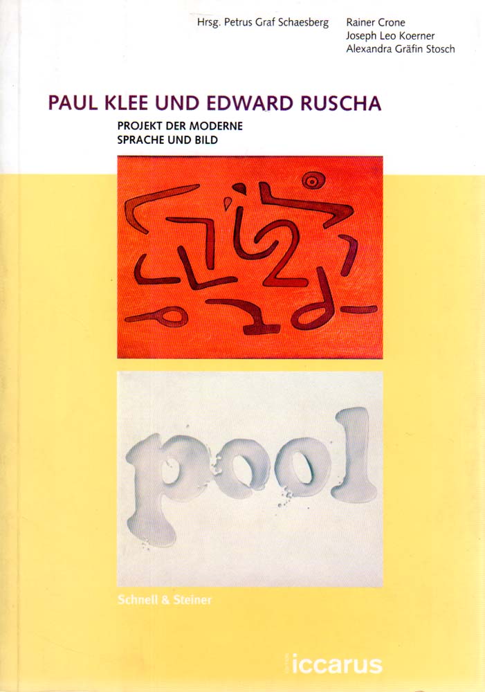 Crone, Rainer [und] Joseph Leo Koerner, Alexandra Gräfin Stosch: Paul Klee und Ed Ruscha. Projekt der Moderne – Sprache und Bild. Mit einer Einleitung herausgegeben von Petrus Graf Schaesberg. Erste Deutsche Auflage. Regensburg. Verlag Schnell + Steiner GmbH. 1998. 21 x 15 cm. 256 S. OKarton mit Klappen. Sehr kleiner Besitzstempel auf dem Vorsatz, Rücken gering aufgehellt, Einband angestaubt, sonst gutes Exemplar. Edition ICCARUS. Mit einigen Abbildungen, teilweise in Farbe.