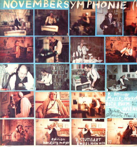 Roth, Dieter / Gerhard Rühm / Oswald Wiener: Novembersymphonie (Doppelksymphonie). 2. Berliner Musik-Workshop. Selten gehörte Musik. Auflage 1000 Stück. 2 x 12“ Vinyl LP´2, F65 163 – F65 – 164. Stuttgart. edition hansjörg mayer. 1973. 32,0 x 31,5 cm. OKarton-Klappcover. Cover mit leichten Gebracuhspuren, am oberen Rand etwas gelöste Folierung. Sonst sehr gutes Exemplar. Cover very good +, Platten near mint / mint. Die Platte wurde aufgenommen am 15. – 26. 11. 1973 in der Wohnung von Gerhard Rühm in Berlin. Das Cover Design ist von Dieter Roth unter Verwendung eigener Fotos sowie von Rühm und Wiener. Die Platte gibt Dialoge, Klangexperimente und freie Improvisationen wieder. Es erschien eine de Luxe Version in 100 Exemplaren mit einer beigegebenen Single und einem Folder mit Label Stickers. Der Extrabogen mit den Stickern liegt hier bei, nicht aber die Single. [Vgl. Dieter Roth und die Musik. Disography Nummer 4, S. 46 – 53].