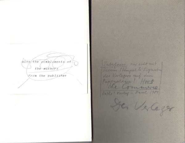 Roth, Dieter / Richard Hamilton: Interfaces. Horse de Commerce. [500 Exmplare]. Basel. Dieter Roth´s Verlag. 1984. 17,5 x 11,0 cm. 240 unpaginierte S. OKarton mit OKlappenumschlag. Sehr gutes, frisches Exemplar. Von der Auflage in 500 Exemplaren ist der größte Teil wegen buchbinderischer Mängel vernichtet worden, die Exemplare wurden dann überwiegend an Freunde verschenkt und kamen nicht in den Handel. Enthält auf dem Schuber einen Stempel „Interfaces, nur echt mit diesem Stempel & Signatur des Verlegers auf dem Pappgehäuse – Horse de Commerce“. Handschriftlich von Dieter Roth unterschrieben mit „Der Verleger“. Beiliegend eine kleine Visitenkarte mit gedrucktem Text „with the compliments of the authors from the publisher“. Der text von Hand von Dieter Roth in Bleistift mit einem kleinen Gesicht übermalt. Die beiden mittels eines gemeinsamen Kartonumschlages miteinander verbundenen Bücher enthalten durchgehend farbige Fotowiedergaben. [Vgl. Dirk Dobke: Dieter Roth – Bücher+ Editionen, S. 221]