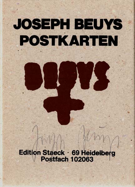 Beuys, Joseph: Postkarten. Heidelberg. Edition Staeck. Um 1985. 16,5 x 12,0 cm. OPapp-Kassette. Sehr gutes Exemplar. Kassette mit 26 frühen Beuys-Postkarten, überwiegend aus der Serie D, Edition Staeck sowie einige andere. Die Karten und die Box mit Postleitzahl 6900 Heidelberg. Auf dem vorderen Einbanddeckel mit einem braunen Siebdruck „Beuys mit Braunkreuz“, darunter handschriftlich in Bleistift von Joseph Beuys signiert. Üblicherweise enthält die Kassette 80 Karten, hier nur ein Teil vorhanden. Beiliegend hier zusätzlich: „Honigpumpe am Arbeitsplatz / Honeypump. Edition Staeck, Heidelberg, 1977. 10 Karten und eine gestempelte Titelkarte in transparenter Kunststoffmappe. Die Edition ist hier nicht signiert.