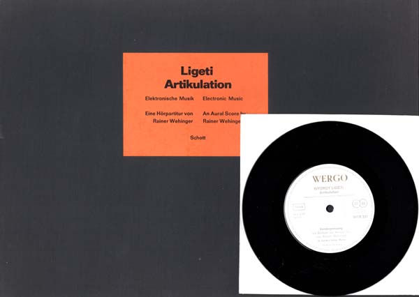 Ligeti, György: Artikulationen / Artikulation. Elektronische Musik. Ein Hörspiel von Rainer Wehinger. / Electronic Music. Am Aural Score by Rainer Wehinger. 1. Auflage. Mainz. B. Schott´s Söhne. 1970. 30,5 x 42,5 cm. 55 S. Schwarzes OLeinen mit orangem Titelschild. Kleiner Einriss am unteren Rand des Vorsatzpapiers, Einband auf der Rückseite am oberen Rand sowie vom Seitensteg ausgehend aufgehellt. Sonst sehr gutes Exemplar. Edition Schott 6378. Mit einem Vorwort in Deutsch und Englisch von Erhard Karkoschka, den erläuternden Texten, einer Tafel mit farbigen Zeichensystemen, 4 Seiten Diagramme und 11 Seiten Hörpartitur in farbig gestalteten Abläufen. Mit der auf dem hinteren Einbanddeckel in montierter Lasche eingesteckten 7“ Vinyl – Single sowie dem orangen Einstecker „mit Schallplatte“. Die Single enthält auf Seite 1 „Artikulation“ sowie auf Seite 2 eine Anleitung zum Gebrauch der Hörpartitur. Die farbigen graphischen Darstellungen besorgte Rainer Wehinger, Typographie und Einband Günther Stiller. Alle grafischen Darstellungen in farbigem Siebdruck, hergestellt durch Domberger KG Bonlanden. Erschien in 200 nummerierten und signierten Exemplaren, hier ein Exemplar ohne Nummerierung und Signatur.