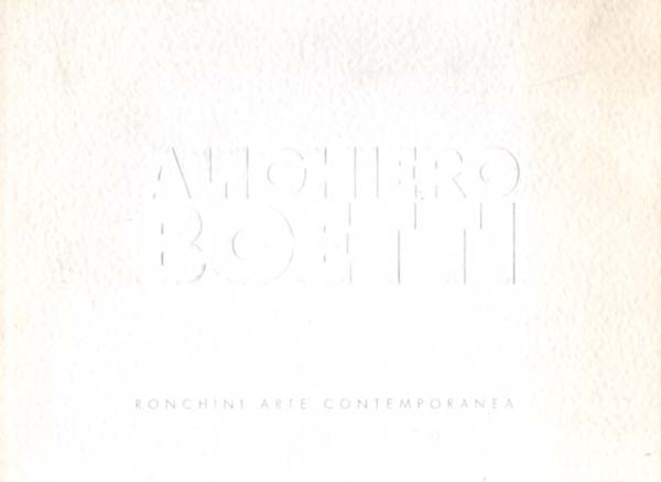 Boetti, Alighiero e: Alighiero Boetti. Ronchini Arte Contemporanea. Terni. Ronchini Arte Contemporanea. 1997. 21 x 28 cm. 32 unpaginierte S. Weißer OKarton mit Titelprägung. Gering angestaubt, von Rücken und Seitensteg her etwas nachgedunkelt. Gutes bis noch sehr gutes Exemplar. Mit einem Text von Daniela Tonelli in Italienscih und 12 abgebildeten Arbeiten sowie einem Foto Boettis im Atelier.