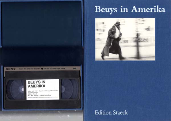 Beuys, Joseph: Beuys in Amerika. Herausgegeben und fotografiert von Klaus Staeck und Gerhard Steidl. Erste Auflage. Heidelberg. Edition Staeck. 1987. 30 x 22 cm. 220 S., 2 Blatt. Blaues OLeinen mit montiertem Foto; Stülpdeckelkarton. Sehr gutes Exemplar. Schöne Fotodokumentation der USA-Reise Joseph Beuys´1974. Mit einer kurzen Einführung von Klaus Staeck in Deutsch und Englisch sowie durchgehend wiedergegebenen Schwarz-Weiß– und Farbfotografien. Auflage: 1500 Exemplare. Dabei die recht seltene VHS-Videoedition „Beuys in Amerika. 1974“ der Edition Staeck in privatem (?) leinenkaschiertem Stülpdeckelkarton mit montierter Abbildung analog dem Bucheinband.
