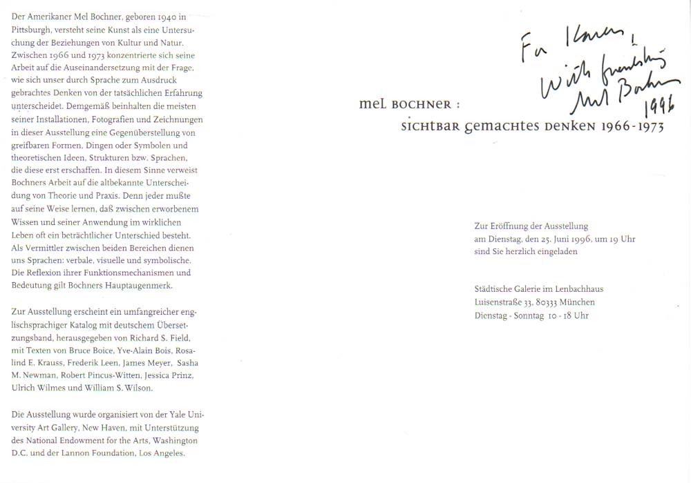 Bochner, Mel – Richard S. Field: THOUGHT MADE VISIBLE 1966-1973. With essays by Brude Boice, Yve-Alain Bois, Rosalind E. Krauss, Frederik Leen, James Meyer, Sasha M. Newman, Robert Pincus-Witten, Jessica Prinz, Ulrich Wilmes, William S. Wilson. [Yale University Art Gallery, New Haven, 14 October-31 December 1995; La Societe des Expositions du Palais des Beaux-Arts, Brussels, 1 March-12 May 1996; Städtische Galerie im Lenbachhaus, Munich, 26 June-8 September 1996]. 1. Auflage. 2 Bände. Yale University Art Gallery. 1995. 27 x 23 cm. 318 S., 1 Blatt. OKarton mit Klappen (Softcover). Band 1 Rücken etwas aufgehellt und lesespurig, Einbandkanten teilweise etwas berieben; Band 2 hinterer Deckel etwas knickspurig und berieben. Gutes Exemplar. Auf dem Vorsatz mit einer kurzen handschriftlichen Widmung sowie einer kleinen Zeichnung in schwarzer Tinte von Mel Bochner, signiert, datiert 1996. Die Zeichnung, 9 x 9 cm, entspricht dem Duktus von Bochners konzeptueller Raumanordnung. Texte in Englisch. Durchgehend mit schwarz-weiß Abbildungen versehen. Dabei der anläßlich der Ausstellung im Lenbachhaus, München, 1996 erschienene Katalog „MEL BOCHNER: SICHTBARGEMACHTES DENKEN 1966-1973“ mit der deutschen Übersetzung der Texte. Dem Katalog liegt die Einladungskarte zur Ausstellung bei, diese ebenfalls mit einer handschriftlichen Widmung von Bochner versehen, signiert und datiert 1996. In dieser Form schönes und auch seltenes Ensemble.