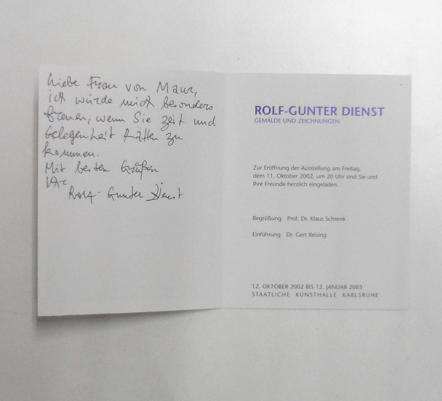 Dienst, Rolf-Gunter: GEMÄLDE UND ZEICHNUNGEN. KUNSTMUSEUM BAYREUTH, 5. FEBRUAR BIS 18. MÄRZ 2012; KUNSTMUSEUM GELSENKIRCHEN, 29. APRIL BIS 17. JUNI 2012. 1. Auflage. Kunstmuseum Bayreuth. 2012. 31 x 24 cm. 95 S. OPappband. Stauchung am oberen Rücken, sonst gutes Exemplar. Schriftenreihe des Kunstmuseums Bayreuth ; 28. Mit Texten von Klaus Schrenk und Martin Engler. Vorwort von Marina von Assel und Leane Schäfer. Durchgehend mit meist farbigen Abbildungen versehen. Beiliegend: Einladung und Flyer zur Ausstellung, davon die Einladungskarte mit einer handschriftlichen Widmung von Rolf-Gunter Dienst, signiert.