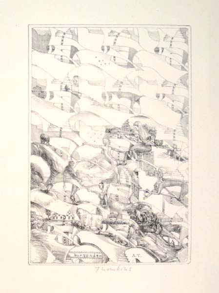 Thomkins, Andre: burgunder. Hamburg. Griffelkunstvereinigung. 1971. 1 Blatt. Leichte Druckstellen im Papier, vier winzige Fixierlöchlien an den Ecken, sonst aber sehr gutes exemplar Lithographie, 1971. Unten Mitte in Bleistift signiert, im Stein betitelt „burgunder“ und monogrammiert. Biattmaß 28,7 x 19,4 cm, auf Velin 64,0 x 49,8 cm. Unnumerierte Auflage. [Vgl. Stähli. André Thomkins. Die Druckgraphik und Monotypisches. Zürich 1977, Nr. 107].