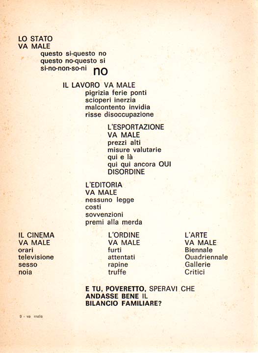 Enthält insgesamt 24 lose Blätter, davon 22 paginiert und mit Textarbeiten, 1 Blatt mit Inhaltsverzeichnis, 1 Blatt mit einer montierten Illustration. Texte in Italienisch. No. 38 von 500 nummerierten Exemplaren.
