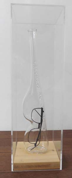 Corner, Philip: A Glass of Glasses. Objekt, Glas und Brille in Acrly-Box mit Holzboden. Objekt 32 x 8 cm, Box 37,5 x 11,7 x 11,7 cm. Unter dem Holzboden handschriftlich signiert. Figürliches Glas mit eingearbeitetem Schriftzug, in der unteren Ausbuchtung eine eingeschlossene Brille. Um 1980.