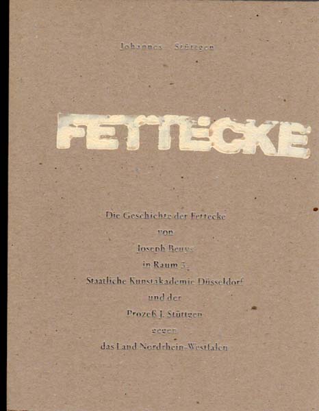 Beuys, Joseph – Johannes Stüttgen: Fettecke. Die Geschichte der Fettecke von Joseph Beuys in Raum 3, Staatliche Kunstakademie Düsseldorf und der Prozeß J. Stüttgen gegen das Land Nordrhein-Westfalen. Erste Ausgabe. Düsseldorf. Edition Achenbach. 1989. 28 x 22 cm. 152 unpaginierte S. OPappe mit Leinenstreifenrücken, Titel „Fettecke“ in weißem Acryl. Einband etwas angestaubt. Gutes bis sehr gutes Exemplar. Dokumentiert akribisch die Entstehung, Vernichtung und den Prozess um die Beuys´sche Fettecke in der Kunstakademie Düsseldorf.