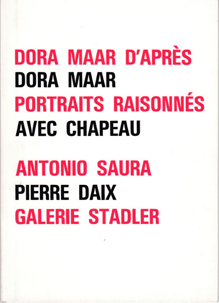 Saura, Antonio: Dora Maar D’Après Dora Maar. Portaits Raisonnés avec Chapeau. Erste Auflage. Paris. Galerie Stadler. 1983. 21 x 15 cm. 32 unpaginierte Seiten. OKarton. Einbandkanten minimal lichtrandig und mit kleinen Bereibungen. Gutes bis sehr gutes Exemplar. Katalog zur gleichnamigen Ausstellun:g Paris 2. Juni bis 9. Juli 19983. Durchgehend mit Abbildungen aus dem Dora-Maar-Zyklus von Antonio Saura sowie einem Text von Pierre Daix in französischer Sprache versehen.