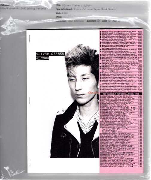 Sieber, Oliver: JSubs. Zweite Auflage. Düsseldorf. Böhm / Kobayashi Publishing Project. 2010. 26 x 21 cm. 74 unpaginierte Bätter. Klammergeheftete Broschur mit Bauchbinde in transparenter Folientasche. Bauchbinde mit kleinem Einriss, sonst noch sehr gutes Exemplar. Enthält duchgehend Fotoporträts japanischer Jugendlicher aus verschiedenen Musikszenen wie Punk, Neo Rockabilly, Psychobilly etc.