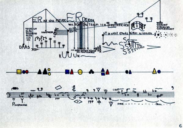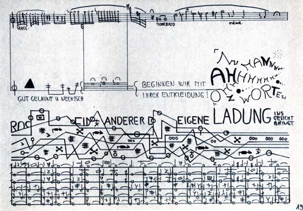 Urmetzer, Reinhold: Das Nackte in der Neuen Musik. Audiovisuelle Szene / Ein Lesebuch. Simultanausführung von – Die Nackte. Kantate für Sopran, Flöte, Frauenchor u. 12 Kontrabässe. Der Nackte. Audiovisuelles Stück für Cello, 2 Tänzer u. Männerstimmen. Erste Auflage. o. O. o. V. [Eigenverlag]. 1972 – 1973. 30 x 42,5 cm [Blätter]; 32 x 45,9 cm [Mappe]. 21 S.; 11 S. Private, geklebte Pappmappe; Blätter lose eingelegt. Mappe etwas berieben und mit Einrissen; Blätter minimal angestaubt. Sonst gutes Exemplar. Partitur eines zweiteiligen, audiovisuellen Stückes, erschienen in einer hektografierten und vom Komponisten handkolorierten, handsignierten und nummerierten Auflage von acht Mappen, hier Exemplar 2/8 M[appen]. Zusätzlich auf der Innenlasche der Mappe handschriftlich gewidmet und mit einer kleinen Notation versehen. Reinhold Urmetzer, geboren am 13.5.1950 in Saarbrücken mit deutsch-französischem Hintergrund, ist ein Multi-Media-Artist. Er studierte Musik, Germanistik und Philosophie in Saarbrücken, Stuttgart und Tübingen, u. a. Komposition bei Erhard Karkoschka und Philosophie bei Karl Otto Apel. Er spielte vier Jahre lang im Ensemble Neue Musik Saarbrücken sowie später in den Rockgruppen Puma und Zoom Orchestra.