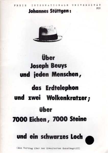 Beuys, Joseph – Johannes Stüttgen: Über Joseph Beuys und jeden Menschen, das Erdtelephon und zwei Wolkenkratzer; über 7000 Eichen, 7000 Steine und ein schwarzes Loch. (Ein Vortrag über den erweiterten Kunstbegriff). Erste Auflage. Gelsenkirchen / Düsseldorf. Freie Internationale Universität FIU / Selbstverlag. 1982. 29,8 x 21,1 cm. 24 S. Illustrierter OKarton. Einband wenig nachgedunkelt, innen papierbedingt lichtspurig und nachgedunkelt. Sonst noch gutes Exemplar. Durchgehend mit wenigen schwarz-weißen Abbildungen versehen.