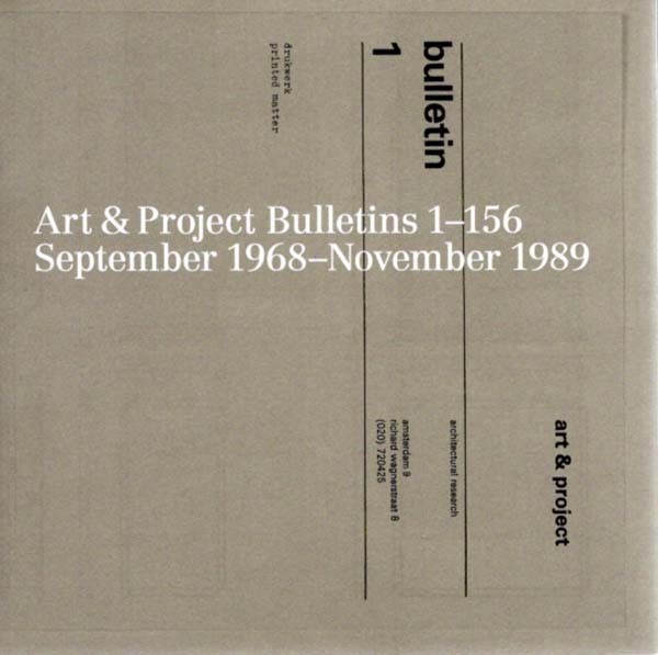 Riley-Smith, Louisa (Herausgeberin): Art & Project Bulletins 1 – 156. September 1968 – November 1989. Erste Auflage. London / Cambridge / Paris. Cabinet Gallery / 20th Century Art Archives / Christophe Daviet-Thery. 2011. 22,5 x 22,7 cm. 84 S. OKarton mit illustriertem OKlappenumschlag. Gutes bis sehr gutes Exemplar. Durchgehend mit schwarz-weißen Abbildungen versehen. Katalog zur gleichnamigen Ausstellung in der Cabinet Gallery, London, vom 17. Oktober bis zum 23. Dezember 2011, bei Christophe Daviet-Thery, Livres et éditions d’artistes, Paris, vom 27. Oktober bis zum 23. Dezember 2011. Texte in englischer Sprache. Im ersten Band der Bulletins hieß es: „″Art & Project plans to bring you together with the ideas of artists, architects and technicians to discover an intelligent form for your living and working space. Art & Project invites you to participate in its exhibitions which will explore ways in which art, architecture and technology can combine with your own ideas.“. Das Bulletin erfreute sich großer Beliebtheit und zog mit dem Erfolg der Amsterdamer Galerie „Art & Project“ auch Künstler der Konzeptkunst an. Für sie bot es eine Möglichkeit, Kunstideen kostengünstig vom Künstler an den Betrachter/Leser zu vermitteln: Es hatte keinen Wert außer den darin enthaltenen Ideen; die Bulletins wurden kostenlos an einen internationalen Verteiler verschickt oder von der Galerie an Besucher verteilt. Die Bulletins enthielten Originalmaterial in einer vom Künstler festgelegten Reihenfolge, der Betrachter/Leser konnte das Material jedoch in beliebiger Reihenfolge lesen, der Künstler präsentierte es jedoch so, wie er es für richtig hielt (Info Netherlands Institute for Art History).