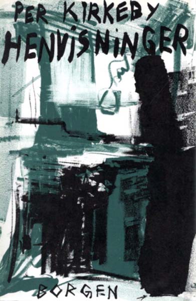 Kirkeby, Per: Henvisninger. Erste Auflage. Kopenhagen. Borgens Forlag. 1983. 22,8 x 15,3 cm. 79 S. OKarton mit illustriertem OKlappenumschlag. Einband etwas angestaubt und nachgedunkelt. Band etwas schräggelesen. Innen papierbedingt nachgedunkelt und wenig stockfleckig. Sonst noch gutes Exemplar. Durchgehend mit wenigen schwarz-weißen Abbildungen versehen. Erstausgabe einer kleinen Gedichtsammlung des dänischen Künstlers Per Kirkeby in dänischer Sprache. Auf dem Vortitelt mit einer kleinen Skizze Kirkebys nebst Widmung (″für Rudi“), Signatur (″Per“) und Datum (4.12.83) in schwarzem Faserschreiber versehen.Aus der Bibliothek des Ausstellungsmachers Rudi Fuchs.