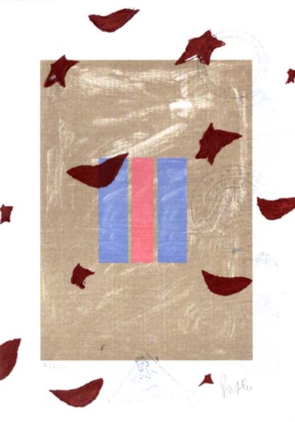 Buthe, Michael: Römisch Drei. Erste Auflage. o. O. o. V. o. J. [1988]. 30,9 x 22 cm; 29,6 x 20,9 cm (Blattmaß). [1] unpaginiertes Blatt. OPappfolder. Folder minimalst angestaubt, sonst gutes bis sehr gutes Exemplar. Originale, unikatäre Farblithografie, auf leichtem Leinenpapier, des deutschen Künstlers Michael Buthe (1944 – 1994). Von diesem eigenhändig mit rostbrauner Ölfarbe und mehreren blauen Stempeln überarbeitet. Unten rechts unterhalb des gedruckten Bildmotivs von ihm handschriftlich in Bleitift signiert und links nummeriert. Aus einer Auflage von 250 Exemplaren, hier Nr. 168/250. In OPappfolder eingelegt. Dieser mit Titelei recto sowie innen mit einer Übersicht der Einzelausstellungen des Künstlers zwischen 1968 und 1988.