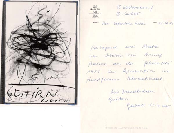 Rainer, Arnulf: Der Elfenbeinturm. (Materialien zu einer Ausstellung). Kassel. Orangerie. 1981. 29,8 x 21 cm (Anschreiben); 23,9 x 17,9 cm (Abbildungen). 1 Blatt, 2 Fotografien. Brief mit Einriß. Sonst noch sehr gutes Exemplar. Handschriftlicher Brief auf Briefpapier Atelier Arnulf Rainer der Assistentin Gabriele Wimmer sowie zwei Fotografien von Arbeiten Rainers, verso gestempelt, die für die Ausstellung „Der Elfenbeinrurm“ zur Verfügung gestellt wurden.