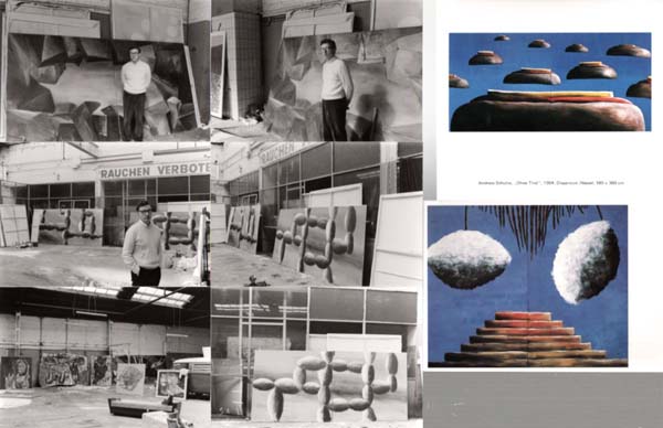 Schulze, Andreas: Konvolut Einladungskarten und Originalfotografien. Köln [u. a.]. Monika Sprüth Galerie / Galerie Six Friedrich / Gebr. König Postkartenverlag / Galerie Ascan Crone / Selbstverlag. 1982 – 1983. [17] unpaginierte Blätter. Zwei Blätter verklebt. Teilweise papierbedingt minimal nachgedunkelt. Sonst gute Exemplare. Das Konvolut besteht aus: drei identische Einladungsfaltkarten der Galerie Monika Sprüth aus dem Jahre 1983 mit jeweils einer montierten Farabbildung nach einer Arbeit des Künstlers; eine Einladungskarte der Hamburger Galerie Ascan Crone aus dem Jahre 1984 mit einer Farbabbildung recto; eine postalisch ungelaufene Einladungskarte der Münchner Galerie Six Friedrich, verso mit einer fünfzeiligen Widmung der Galeristin an ein Sammlerehepaar; eine weitere Einladungskarte der Galerie Six Friedrich zu einer Ausstellung aus dem Jahre 1982; eine Postkarte des Gebr. König Postkartenverlages mit einer Farbabbildung einer Arbeit Schulzes, verso mit einer fünfzeiligen Notiz von unbekannter Hand (Schulze?); zwei verklebte Blätter mit drei farbigen Fotoabzügen mit Ausstellungsansichten und einer Porträtfotografie des Künstlers; Konvolut von acht schwarzweißen Fotoabzügen mit Atelieransichten und Porträts des Künstlers, in einem Briefumschlag, beschriftet „Atelier Andreas Schulze in Köln 1983“.