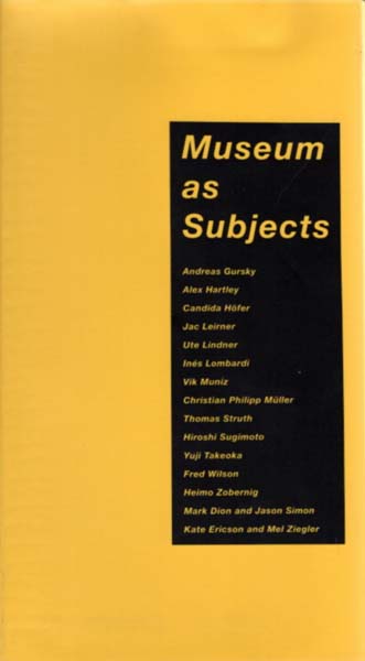 Museum as Subjects. Andreas Gursky – Alex Hartley – Candida Höfer – Jac Leirner – Ute Lindner – Inés Lombardi – Vik Muniz – Christian Philipp Müller – Thomas Struth – Hiroshi Sugimoto – Yuji Takeoka – Fred Wilson – Heimo Zobernig – Mark Dion and Jason Simon – Kate Ericson and Mel Ziegler. Erste Auflage. Osaka. Kokuritsu Kokusai Bijutsukan [The National Museum of Art]. 2001. 27 x 15,2 cm. 88 S. Flexibler OPlastikeinband. Sehr gutes Exemplar. Durchgehend mit meist farbigen Abbildungen versehen. „Museum as Subjects“ war eine Ausstellung, die vom 25. Oktober bis 11. Dezember 2001 im Nationalen Kunstmuseum Osaka (NMAO) stattfand. Die Ausstellung untersuchte, zusammen mit anderen Ausstellungen in diesem Jahr, die Institution des Museums selbst als Gegenstand künstlerischer, sozialer oder historischer Reflexion. Texte in japanischer und englischer Sprache.