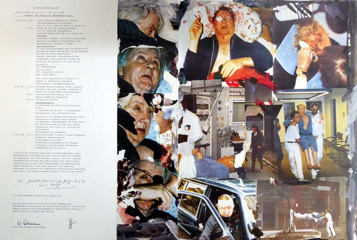 Janssen, Horst: UNFALLBERICHT. [Plakat / Poster]. 1990. 65 x 97 cm. Untere linke Kante minimal knitterspurig, sonst gutes Exemplar. Offsetdruck. Links unten, unter dem Unfallbericht von Priv.-Doz.Dr.med.D. Hallermann in Bleistift von Horst Janssen monogrammiert.