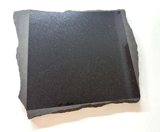 Basalt geschnitten, geschliffen, poliert und sandgestrahlt, 48 x 35 x 3 cm. Auflage 33 Exemplare (+ 4 Künstlerexemplare). Rückriem zerschitt für diese Edition des Museumsverein Abteiberg einen vorgefundenen länglichen Steinblock in ca. 37 schmale Teile, die jeweils 2 – 3 cm stark sind. Eine der Schnittflächen wird jeweils auf Hochglanz poliert. Aus diesen tiefschwarzen Flächen arbeitete Rückriem jeweils die Grundform des je größten möglichen Quadrates heraus. Somit ist jeder Stein ein Unikat, da jeweils die Maße und Kanten variieren. Beiliegend das Prospekt des Museumsvereins zu den Jahresgaben 1987 mit Daten und Skizzierung der Edition.